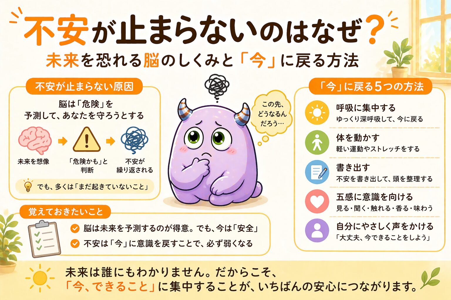 この記事では、未来への不安が止まらないしくみと、今この瞬間に意識を戻すための実践を整理します。