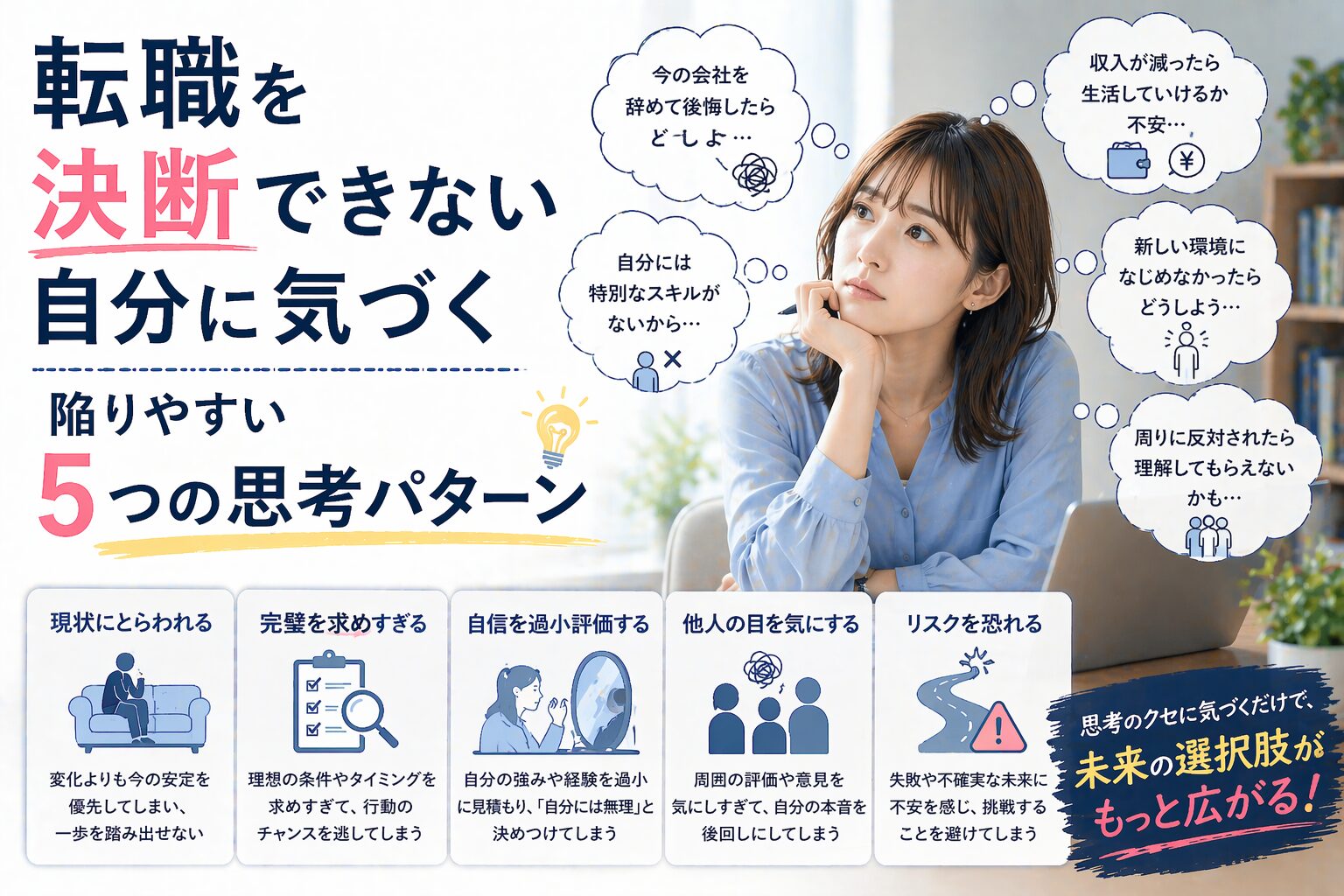 ここまで、転職を決断できない人が陥りがちな5つの思考パターンを見てきました。